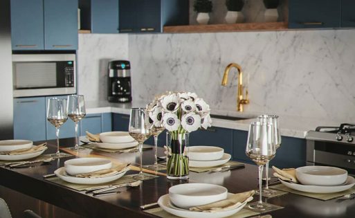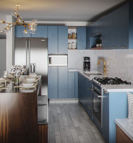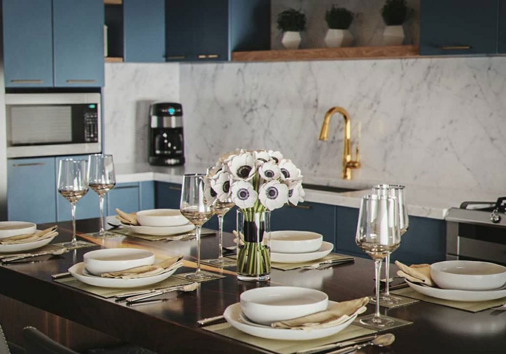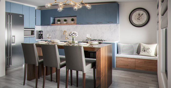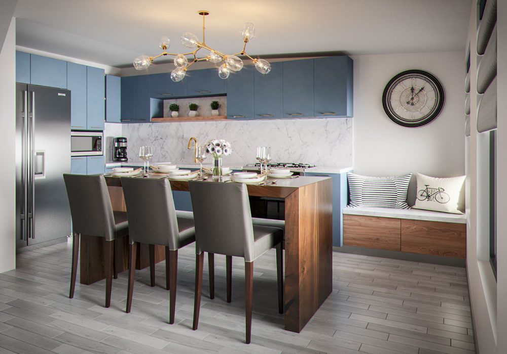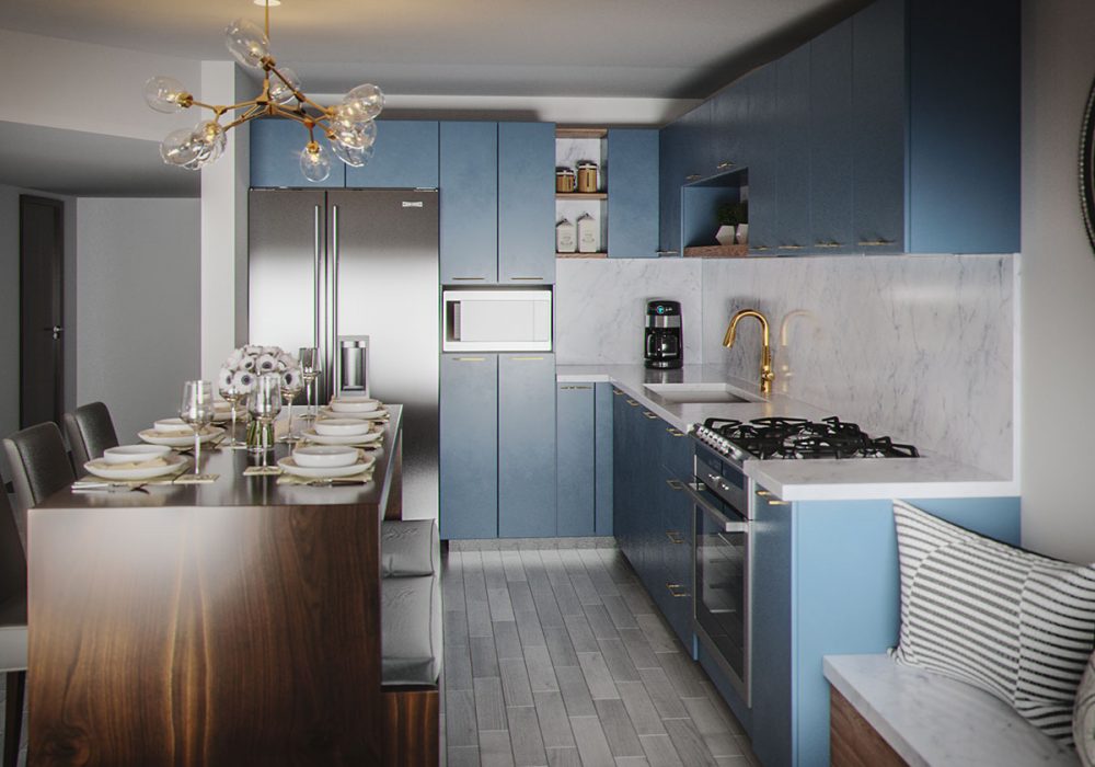 Diseño interior en Frac. Nuevo Mexicali. Desarrollando un concepto contemporáneo en tono azul (muy en tendencia) combinado con madera de parota y accesorios dorados, se logró fusionar el espacio de cocina y comedor.