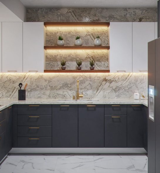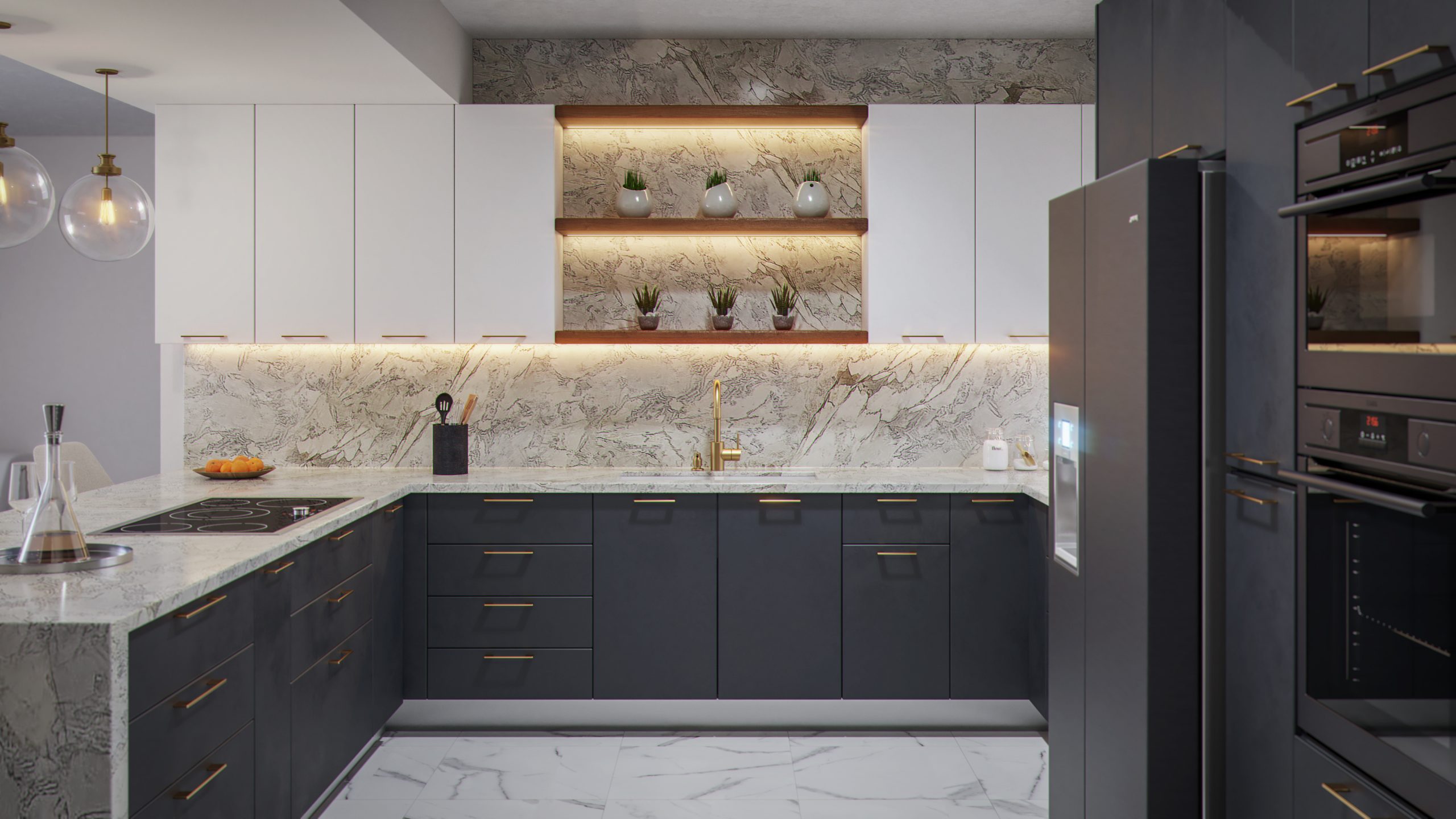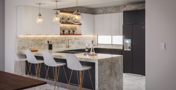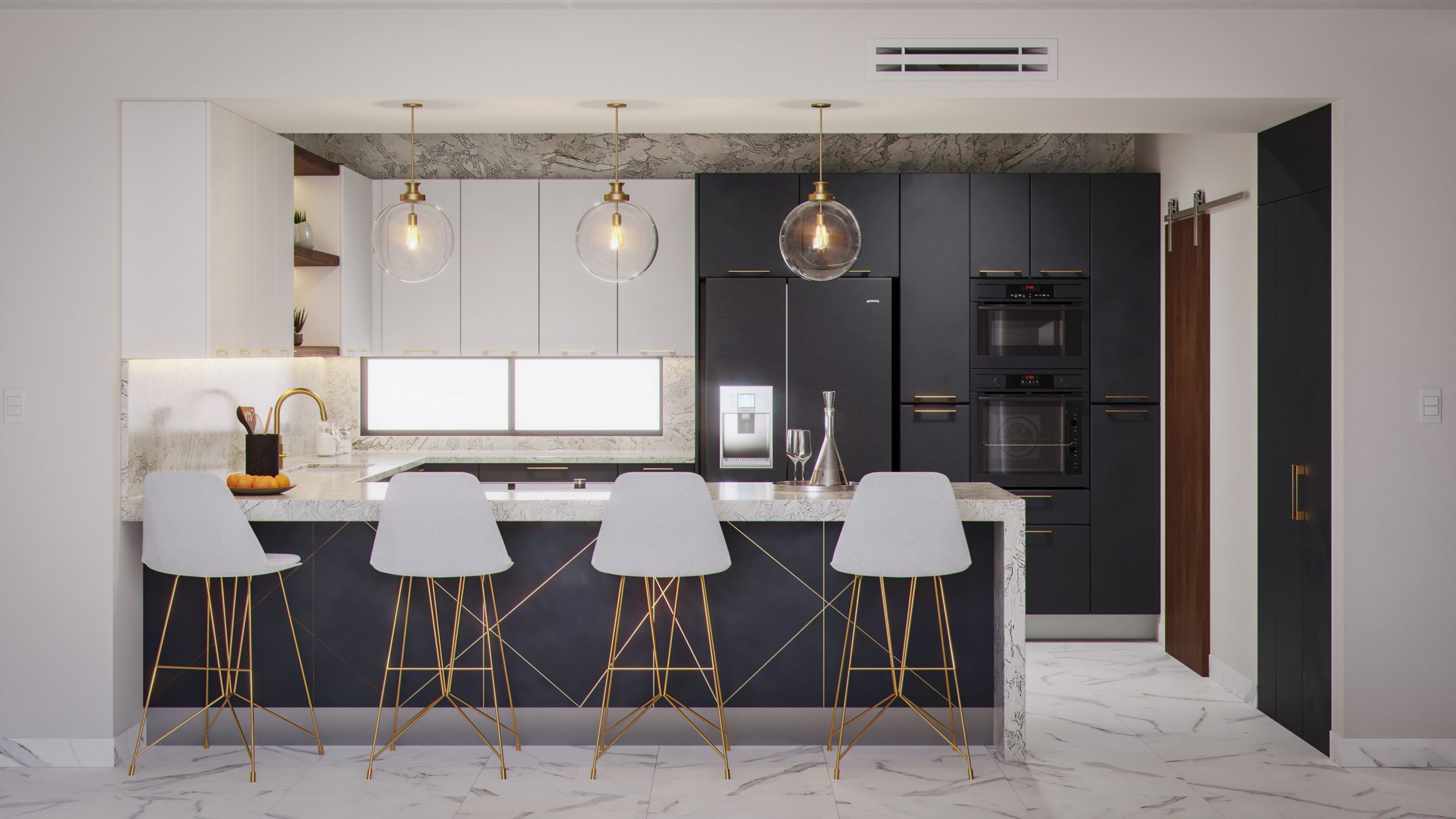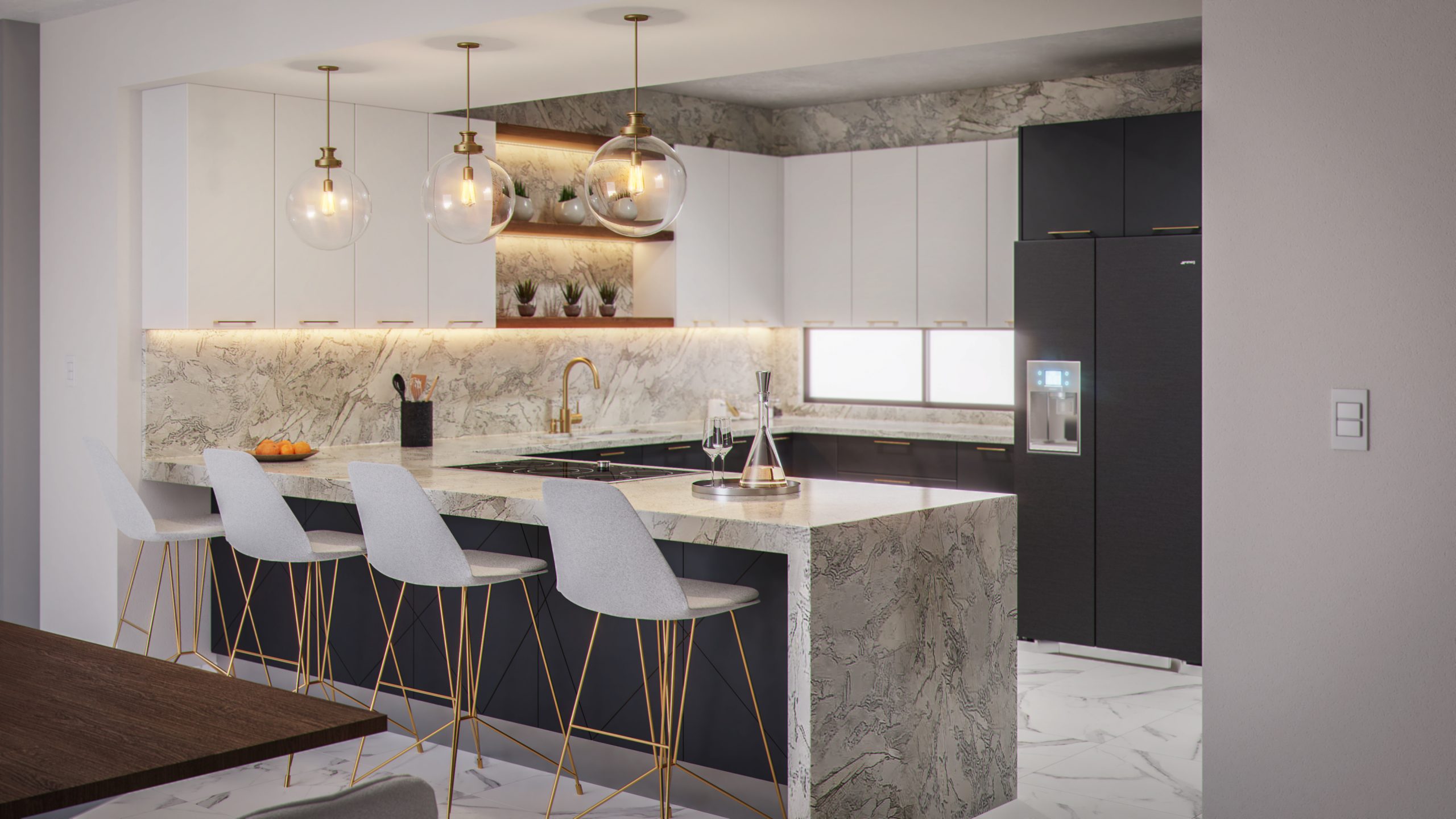Diseño interior en Calzada Residencial. Cocina contemporánea con puertas lisas en color azul para la parte de abajo y blanca en alacenas, se eligieron electrodomésticos en color negro y para darle un toque de elegancia colocamos accesorios en dorado combinando con las betas de la cubierta de granito exótico.
